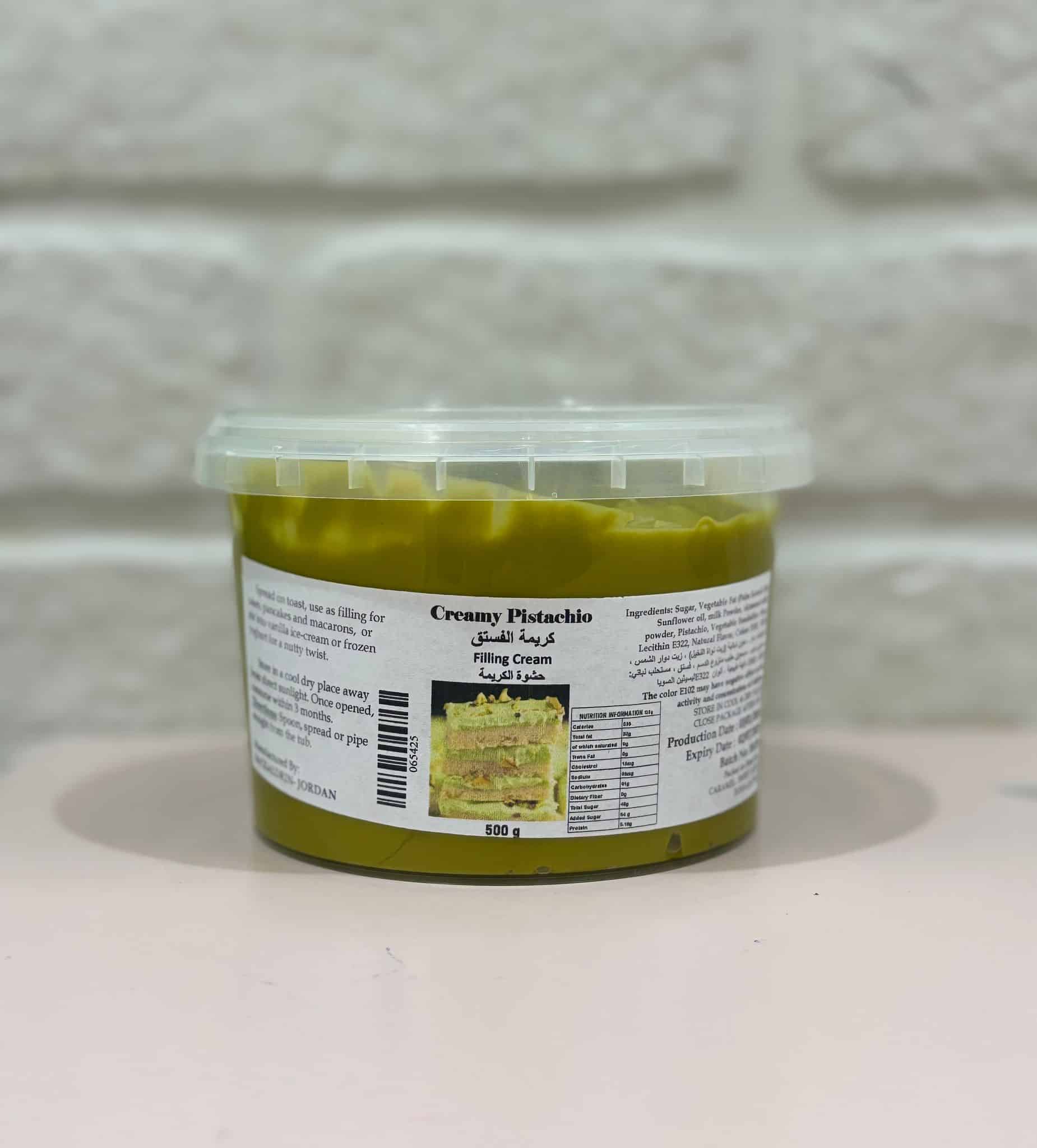 Ingredients:Β Sugar, Vegetable Fat (palm Kernel Oil) Sunflower Oil, Milk Powder, Skimmed Milk Powder, Pistachio, Vegetable Emulsifier : Soya Lecithin E322, Natural Flavors, Color E102, E132
