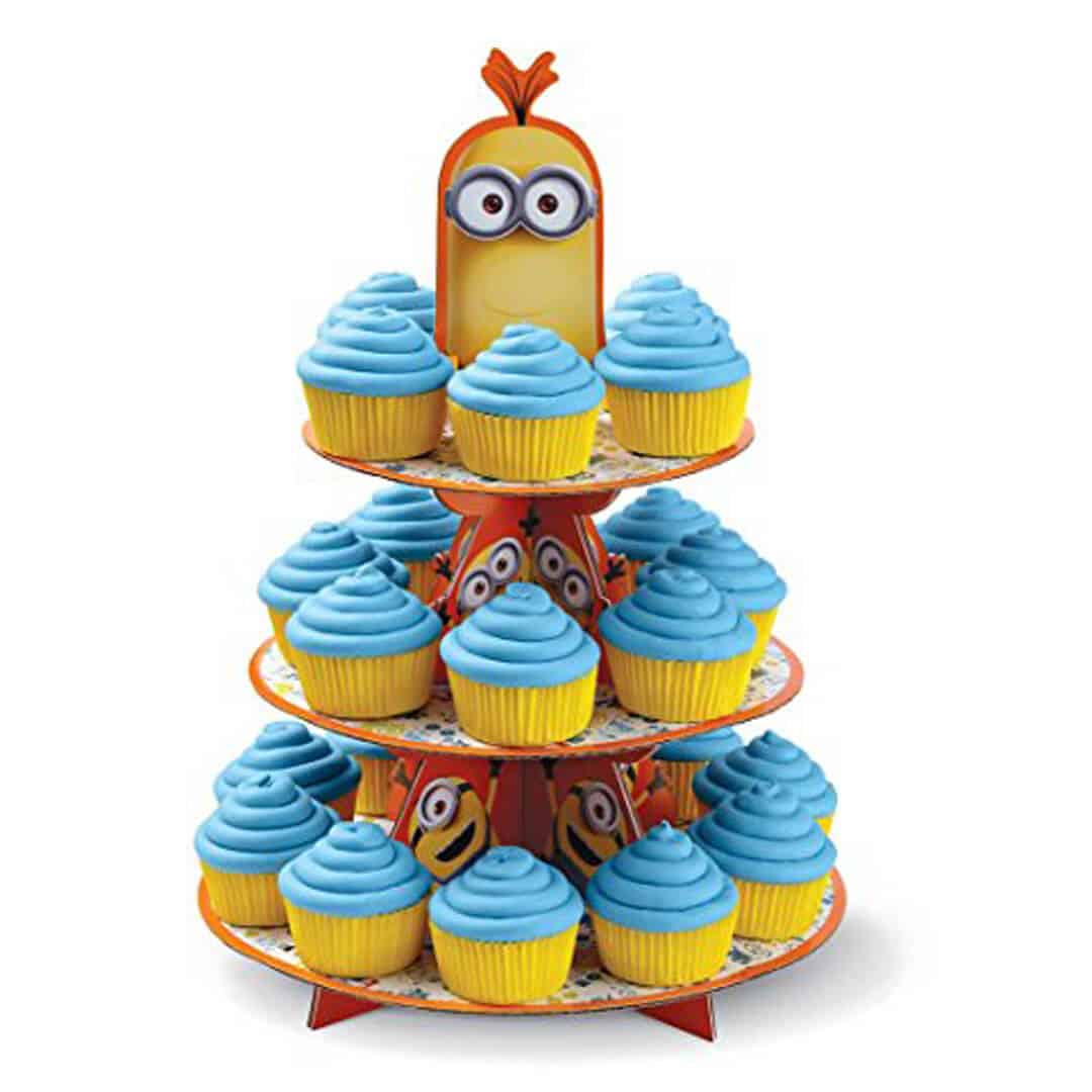Can Hold 24 Cupcakes. A party is always in the making when you have the Despicable Me cupcake Stand on hand. In minutes, you can create a bright and colorful 3-tier cupcake stand with a fun decorative topper. Your cupcakes and treats will look perfect for the party.