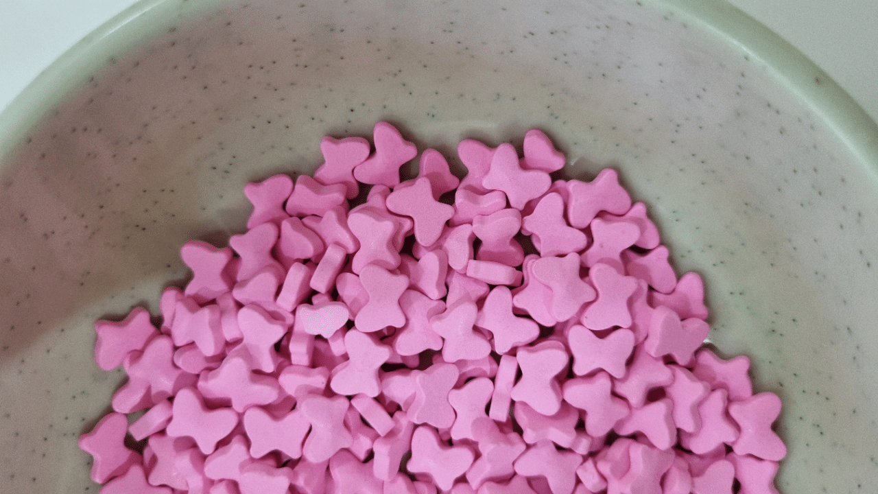 Ingredients: Sugar, Corn Starch, Glycerin, Maltodextrin, Shellac, Vanilla E129, E133, E102, E170, E211, E331, E415